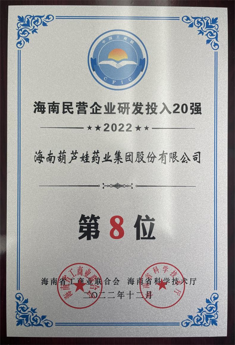 12月23日,2022海南民营企业50强和研发投入20强发布会在海口举行。会上发布了“2022海南民营企业50强”“2022海南民营企业研发投入20强”榜单和分析报告。宝博药业再次荣登两榜,在海南民营企业50强榜单中位列第25位,较去年上升8位,这也是公司连续三年登榜;在海南民营企业研发投入20强中位列第8位,较去年上升7位。